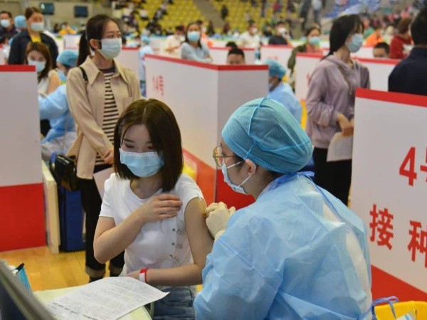 东莞塘厦体育馆新冠疫苗接种现场 定制铁罐工厂免费接种新冠疫苗中